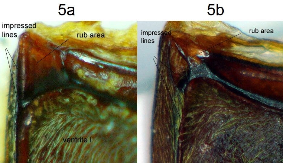 5b. Broad structure of lateral depressions and small rub area of the first visible abdominal ventrite. Go to species group: bicolor