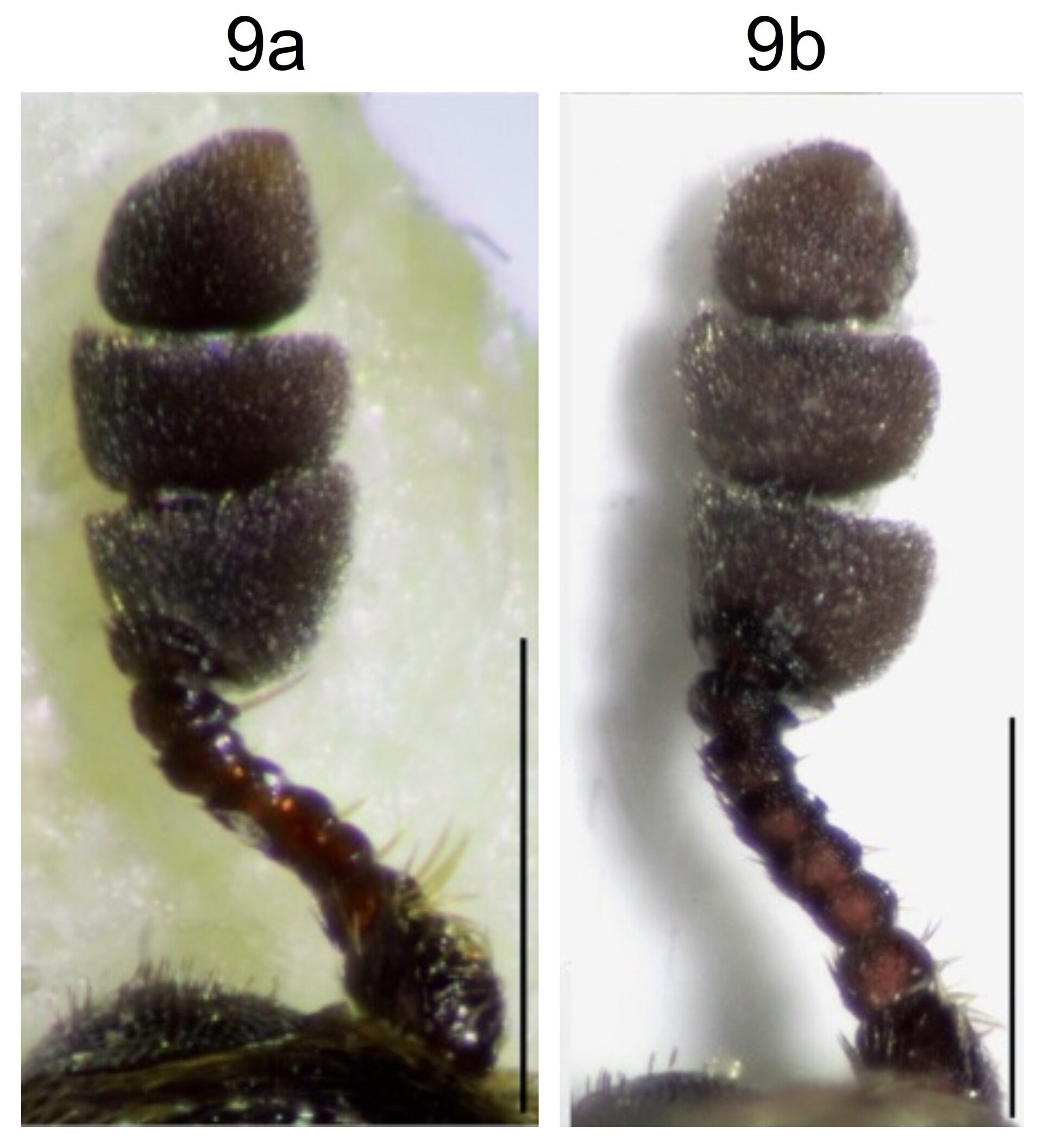 9a. Terminal antennal segment more asymmetrical with a stout spine on anterior surface of antennomere; shape of male genitalia.